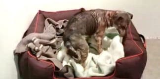 Dog Pulled From A Life Of Neglect Is Shown A Bed...