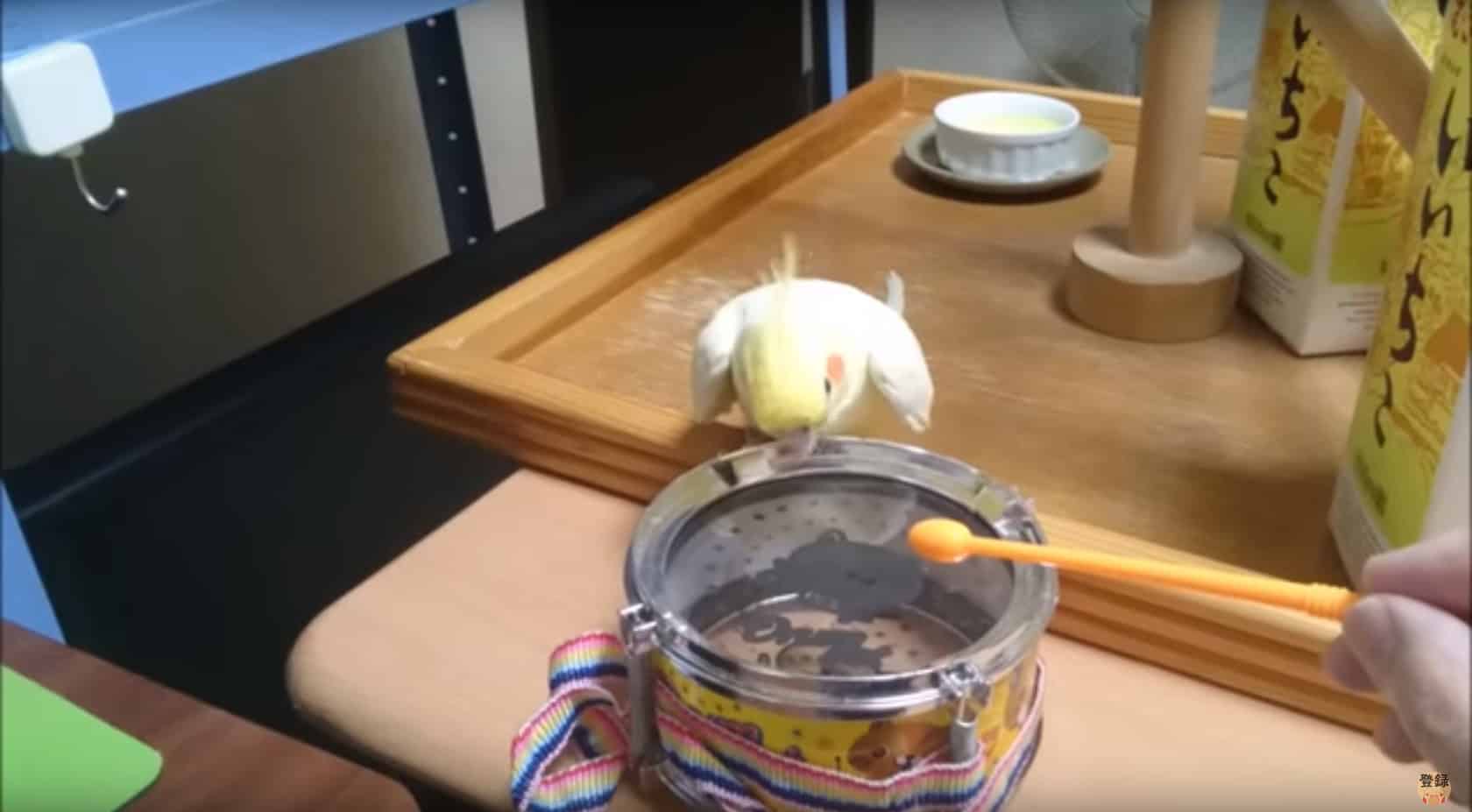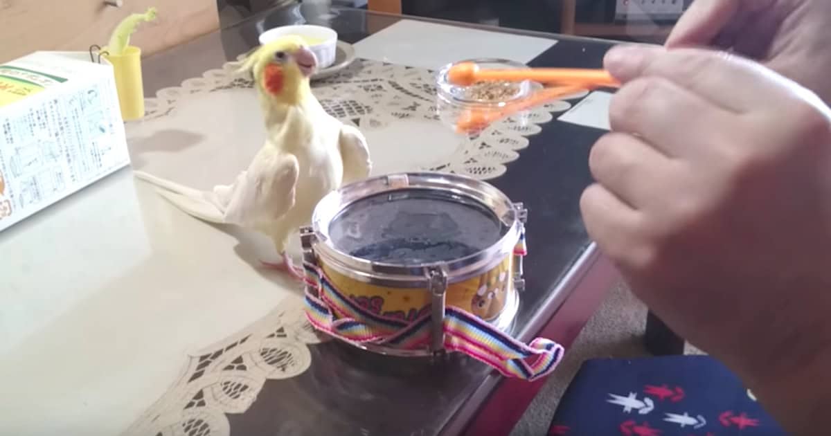 Dad starts tapping on the tiny drum, and the Japanese cockatiel starts bobbing its head to the beat. The bird then waddles over and uses its beak as a drumstick to start playing along. This is one talented bird — just look at it go!