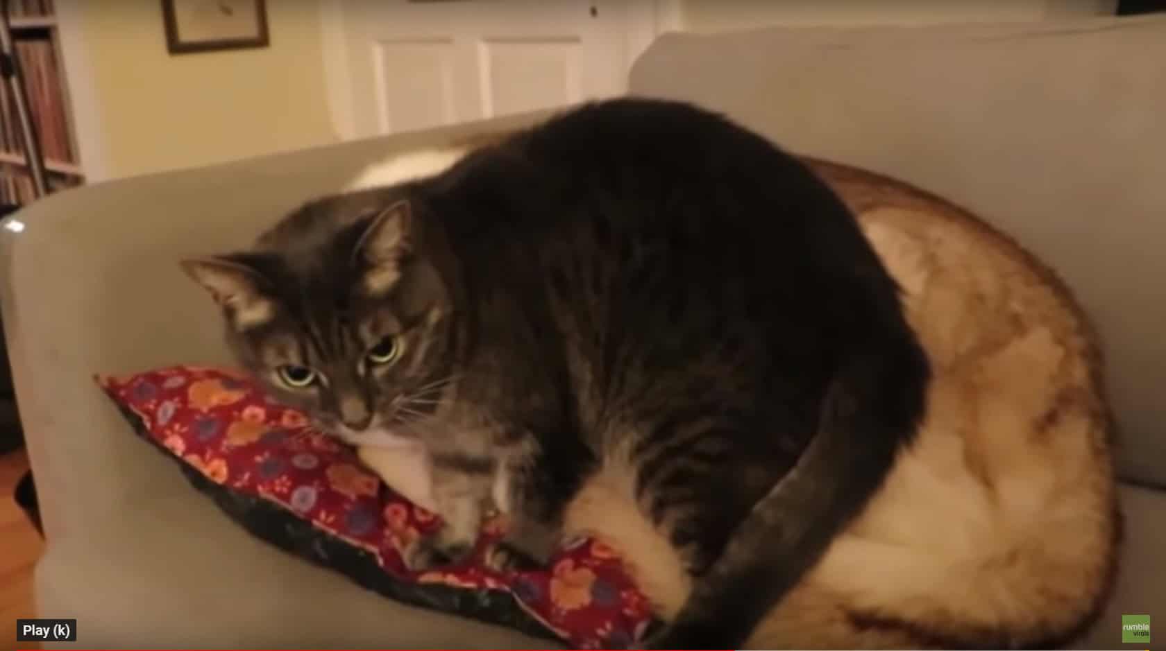 First things first, to ready this sleeping spot. The cat kneads at the Husky to prepare and fluff up the new “bed.” Finally, the silly feline plops down on the Husky. And throughout this entire thing, the Husky hardly batted an eye. He was so calm and cooperative. Maybe he’s just used to this cat’s crazy shenanigans!