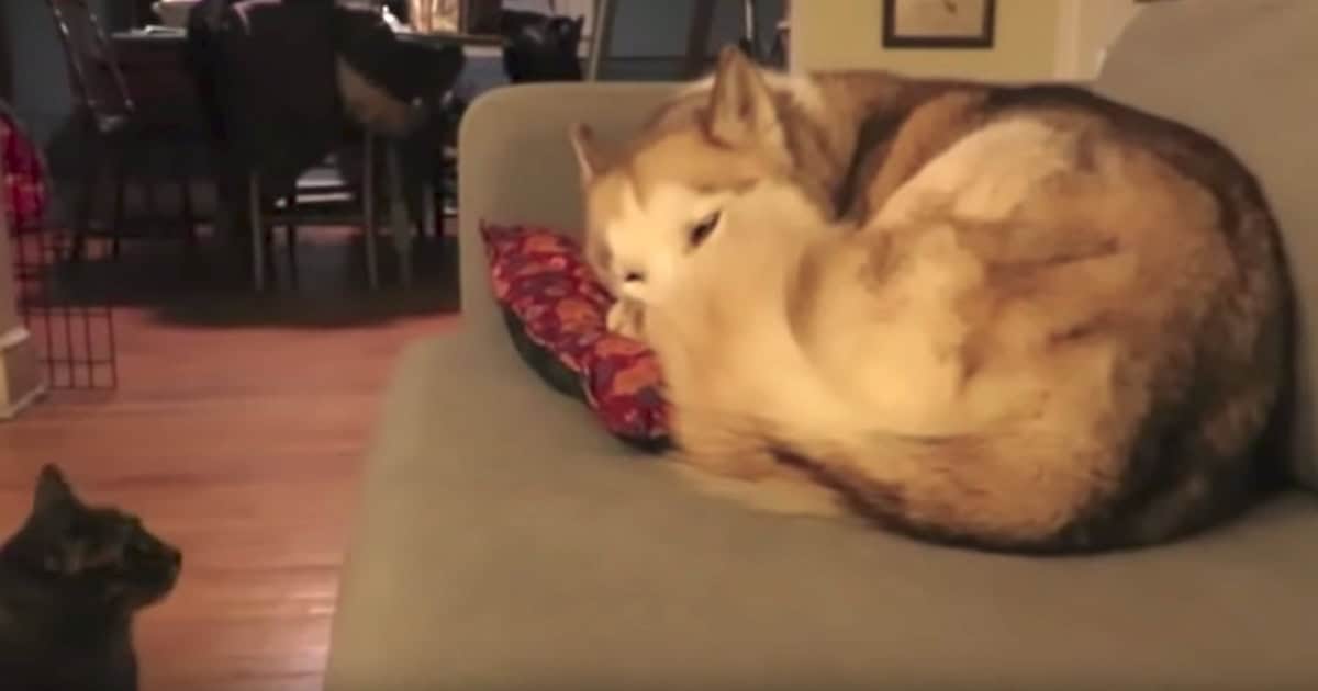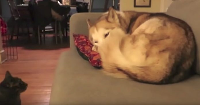 Animals do the darndest things. And here, we have a cat who, out of all of the comfortable spots in the entire house, decides the best place to sleep would be right on top of the Husky! The cat moves in on the sleeping pooch in preparation for a nice long nap.