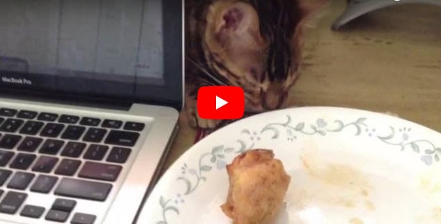 This Bengal kitty, however, has a whole different tactic in mind; he pretends to be adorably asleep and inches his way forward toward a chicken leg.