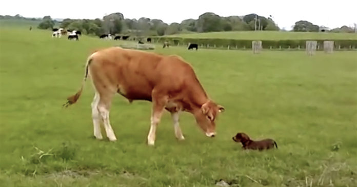 Lana the 6-month-old Dachshund puppy sees a cow for the very first time in her young life. The pup can’t contain her excitement as the cow curiously checks her out. It seems as if Lana really just wants to play, but she’ll have to settle for a boop and a smooch on the nose! How cute is that?