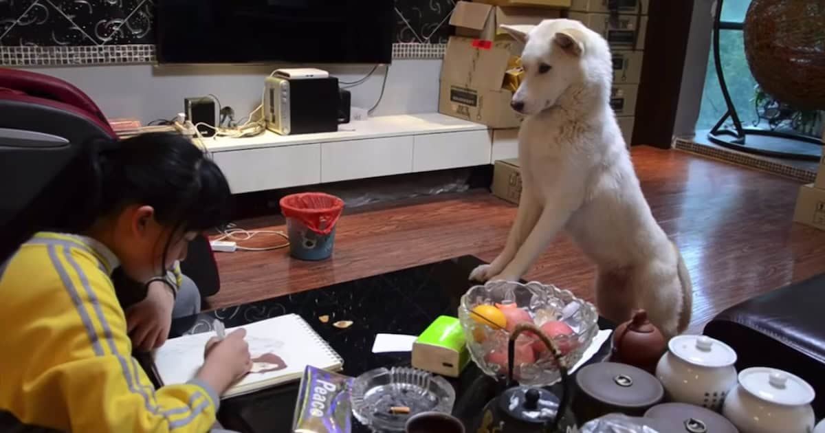 A man in southern China’s Guizhou province taught the family dog, Riceball, to watch over and supervise his daughter as she does her homework. She would always become distracted and play on her phone when trying to do her work, but no longer!