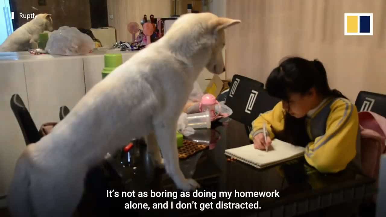It all started when the dad, Xu Liang, taught the dog to guard food from the cat. That’s when he got the idea. Xu Xinya actually doesn’t mind it though as she realizes it helps her get her work done. She says it’s not as boring as doing her homework alone, and it feels like she has a classmate!