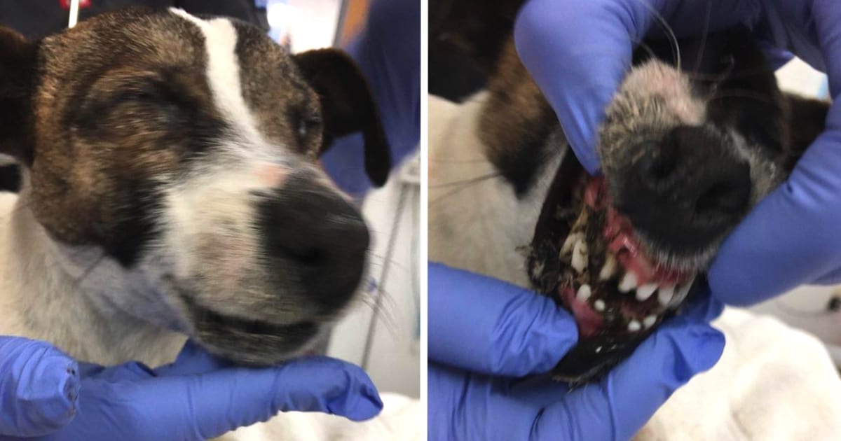 A Terrier mix was abandoned on a busy road with her eyes and mouth glued shut. The Good Samaritan who found her first thought the dog was dead, and that was clearly someone’s goal here. She was rushed to the hospital where they also found bruises on her body, and they worked for hours to remove the glue and fix her up.