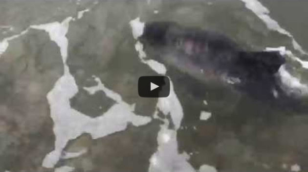 Coming closer, he realized that Leia had found a baby dolphin (or maybe a baby porpoise?) stuck on the sand. This good samaritan carefully and gently guided the baby back into the ocean … all while recording the rescue on video.