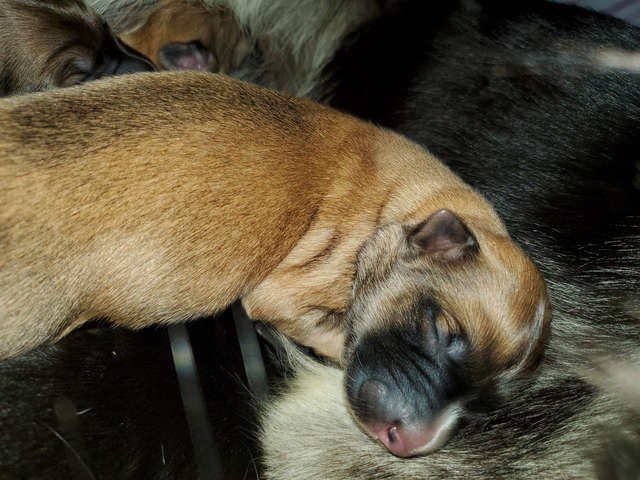 The mama was thin and her pups only about a week old. She struggled to provide for her family because of this neglect. The Good Samaritan took the family to the vet where they stayed for a night before being sent to the British Columbia Society for the Prevention of Cruelty to Animals (BC SPCA). No foster families were available at the time, so the dog family was taken to the BC SPCA’s Quesnel and District branch where the staff did everything they could to comfort and care for the dogs.