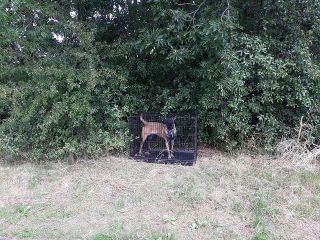 At a carpool pickup area in Nieuwegein in the Netherlands, some people noticed a cage off to the side near the woods with an animal inside. It was a dog, all alone with no food or water. The police were contacted, and they arrived as fast as they could to the dog waiting on someone to help her.