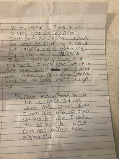 “Hi my name is Zues [sic]. I am a very good dog. My owner just cannot afford me anymore,” the note reads. “She tried to find me a home but nobody would take me.”
