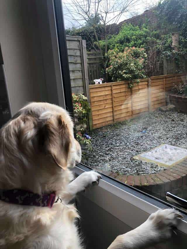 When Mom lets her out, the first thing the dog will do is jump at the fence to see if Loki is out. If he’s not, Lola waits right by the fence! Sometimes the owners will come out to see Loki in Lola’s yard where they’re playing together.