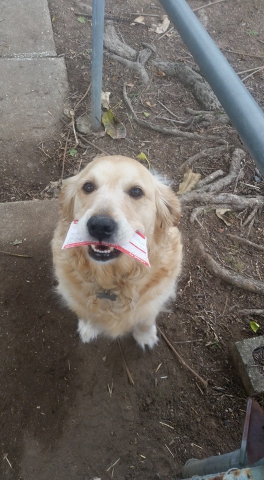 Pippa the dog runs to greet the mailman every day. She then takes the mail back to her family fulfilling her role as “mail-grabber” in addition to “protector of the house.”