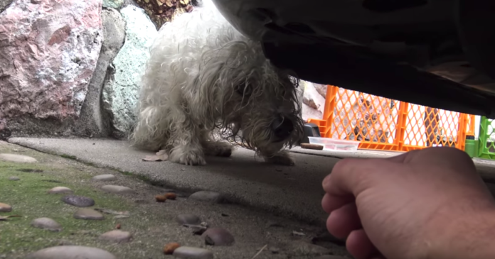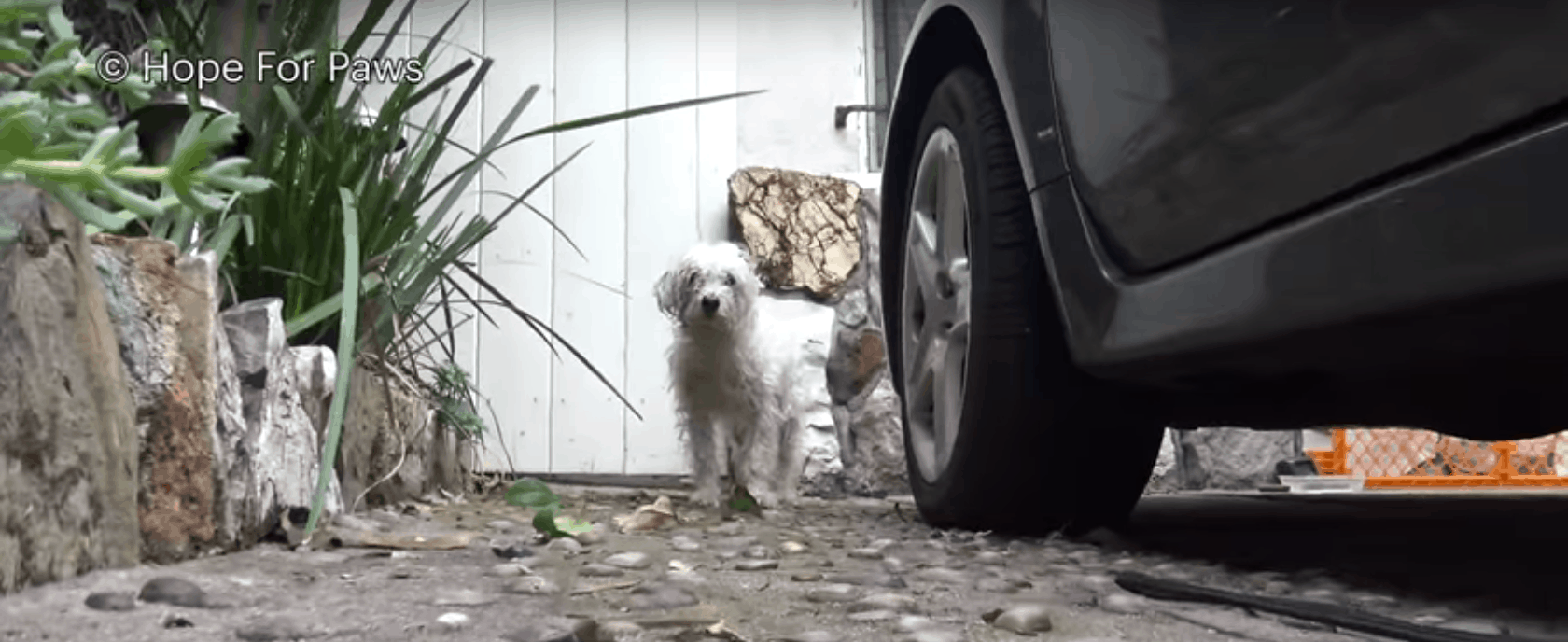 Hope For Paws received a text on their emergency line about a dog who needed help. And the person who sent the text offered to assist with the rescue. When they arrived, they saw the scared little white dog hiding behind a car in a driveway. Rescuers secured the area with a fence.
