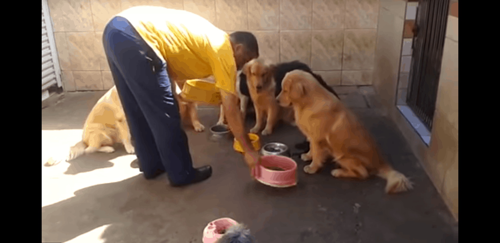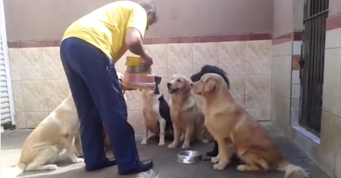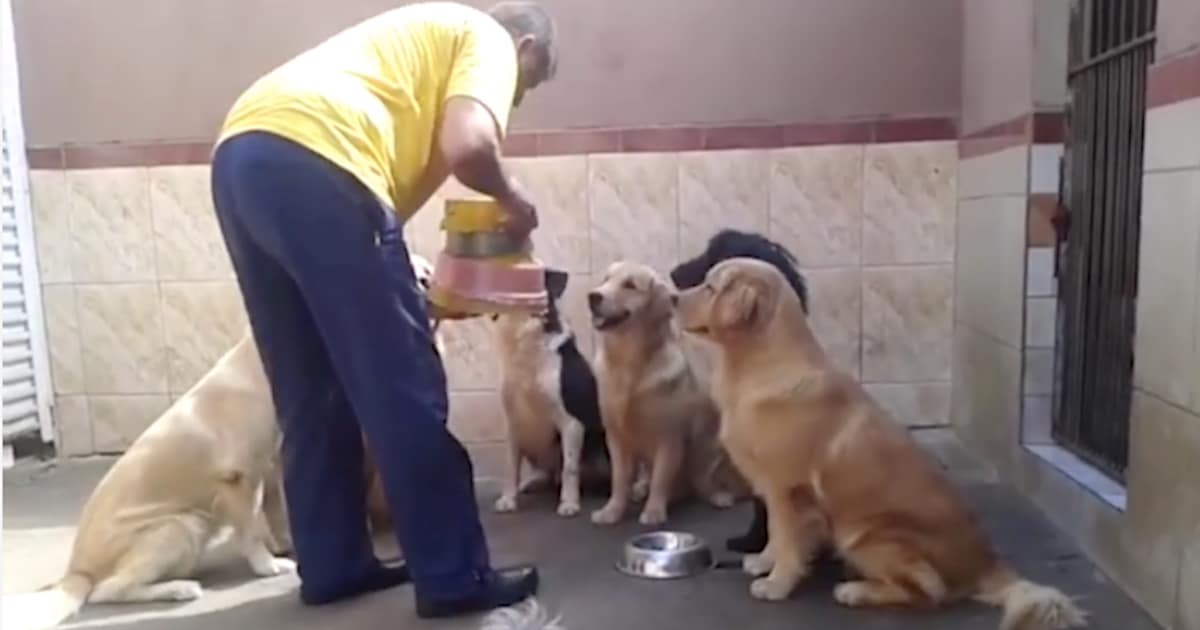 The dogs wait to hear Dad’s command after he places a bowl in front of each and every one of them. The patient pups hardly pay any attention to their own bowl while Dad’s in the middle of the dinner routine. And then it’s chow time.