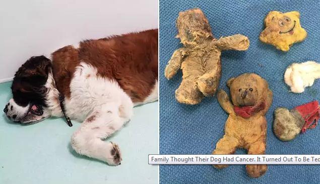 What began as a frightening ordeal and a possible cancer diagnosis for a St. Bernard turned from heartbreak to relief when it turned out the mass on the dog’s spleen was actually a big ol’ pile of swallowed dog toys.