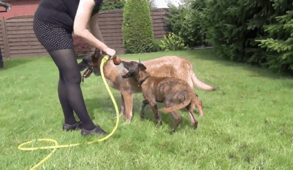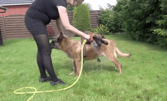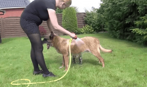 Mom, knowing her dog and his shenanigans all too well, continues on unsurprised. She does start to shower him with the hose a little bit here and there, but it’s not enough! After trying to jump on big brother’s back, the water-loving pup heads around to the other side to try to get between the hose and dog.