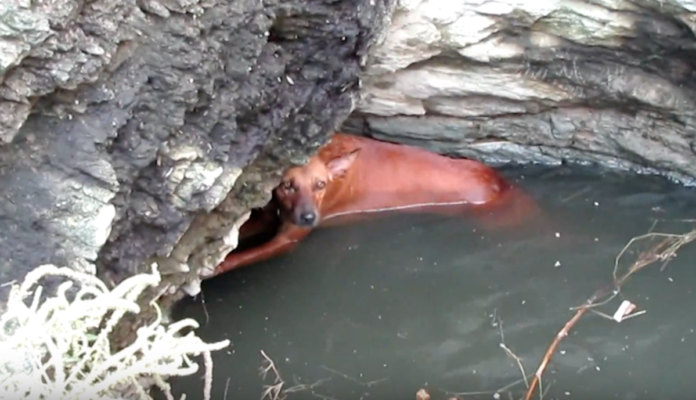 A dog had fallen into a deep water well and was clinging on for life with nowhere to go. She’d managed to prop herself onto a little ledge and hang on for a few hours before being spotted by some children in the area. She was exhausted and terrified.