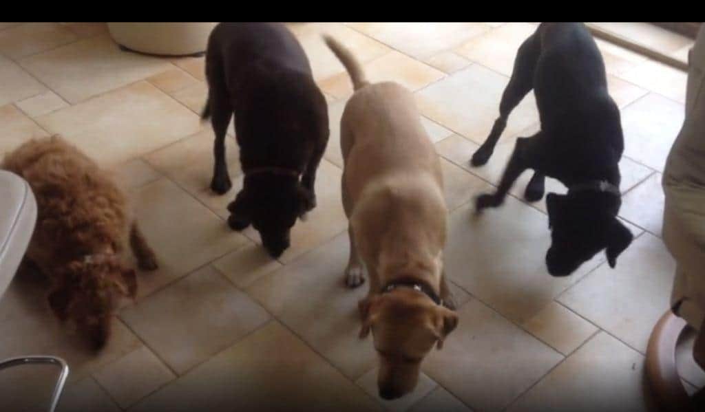 Dad lays a treat in front of each of the four dogs, and they await his command. They pull of the synchronized snack trick with impressive form! But the best part may be at the end when Hank the Lab gives a cheeky grin.