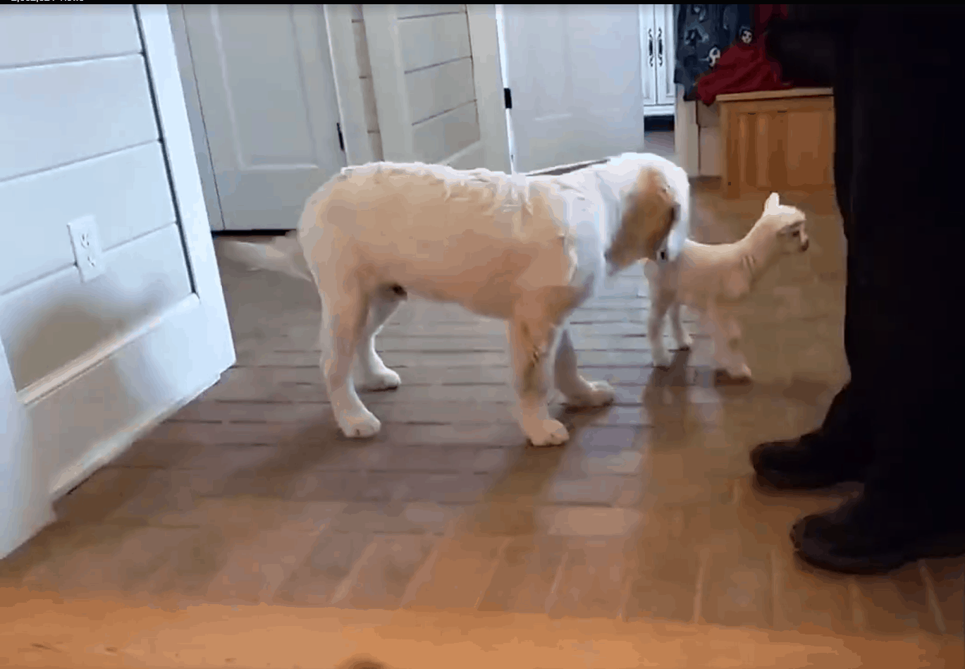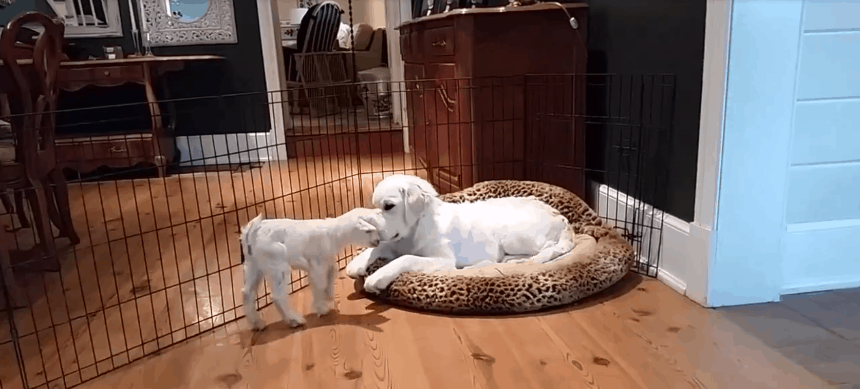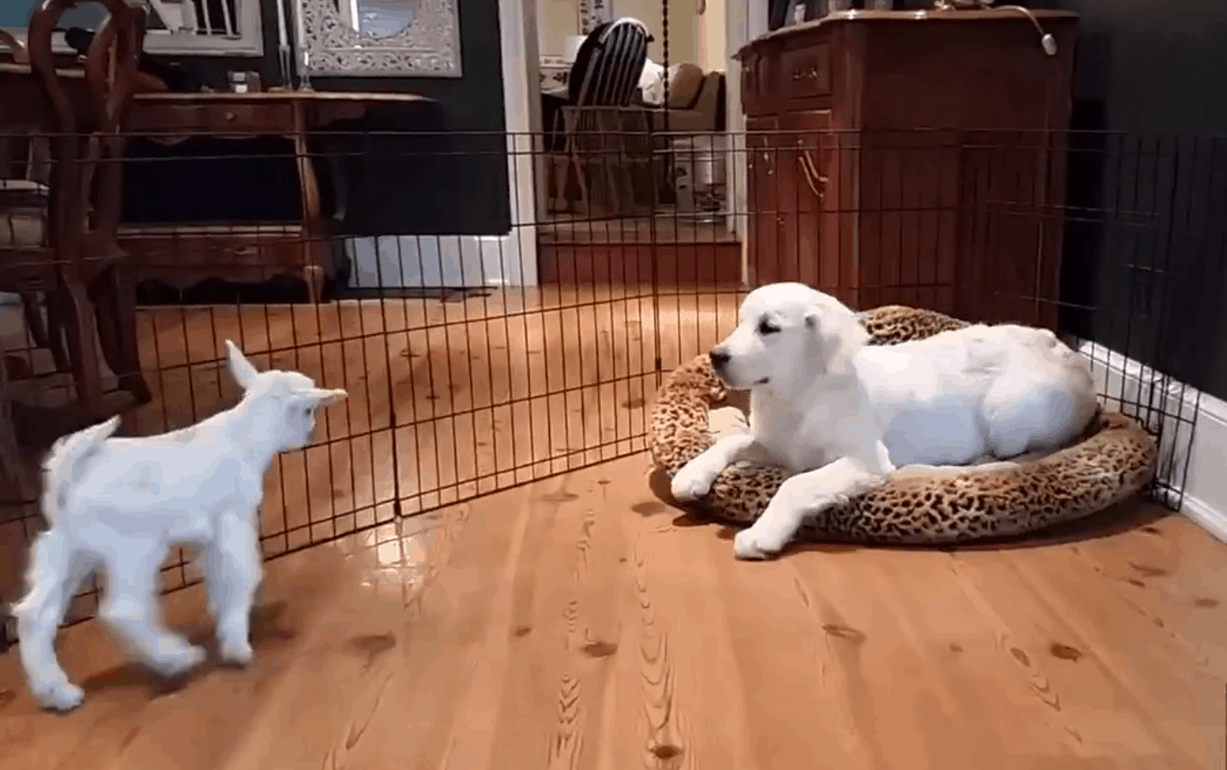 A four-month-old Golden Retriever puppy meets a four-day-old baby goat and completely loses it! He just can’t contain the excitement…