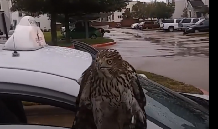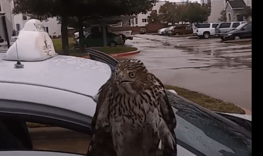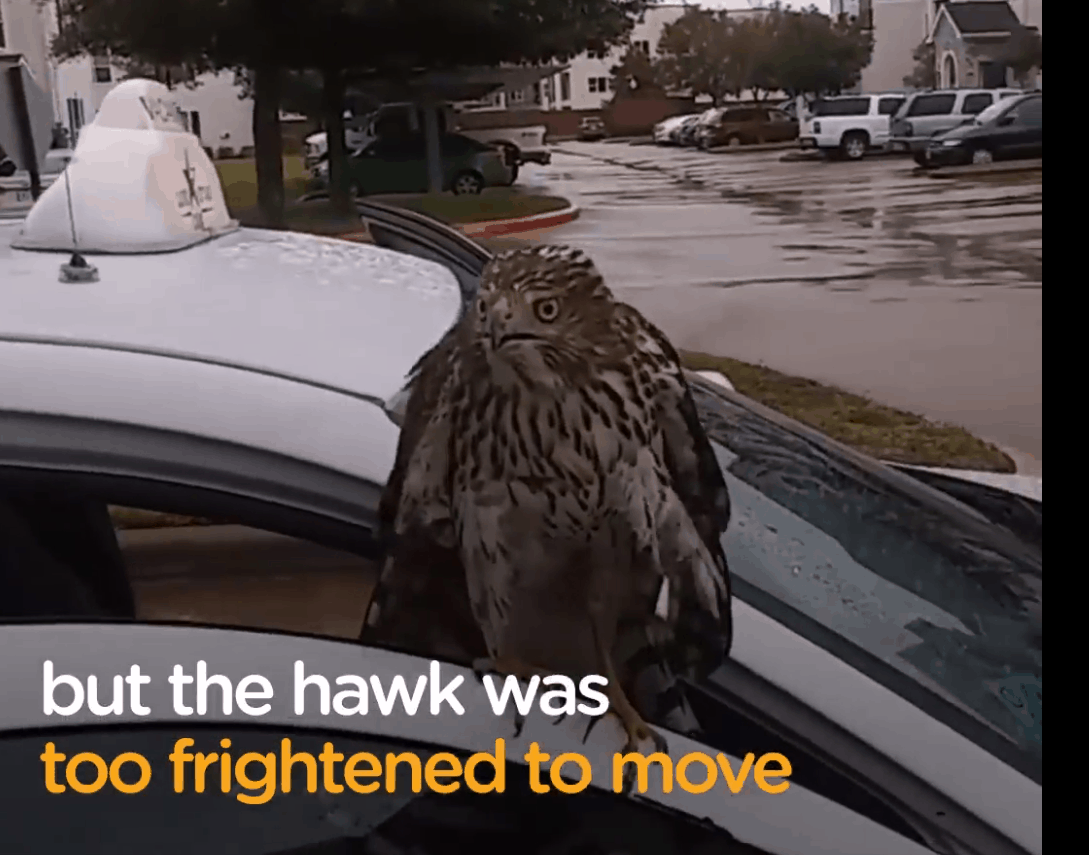 Hurricane Harvey is affecting people and animals alike, and this hawk decided to hunker down with a family to ride the storm out together. The scared hawk sought refuge in this man’s vehicle, and it turned out to be the right decision.