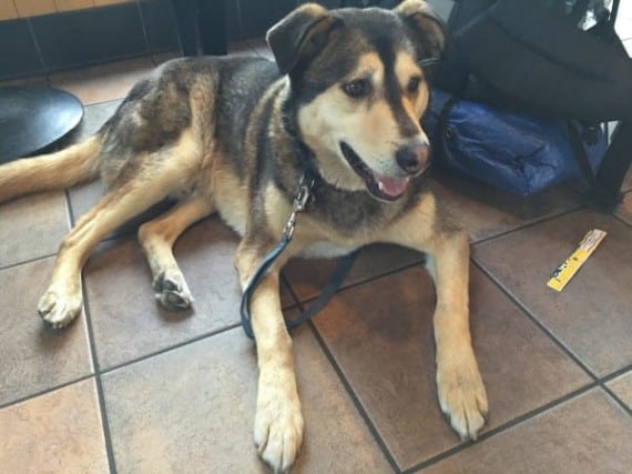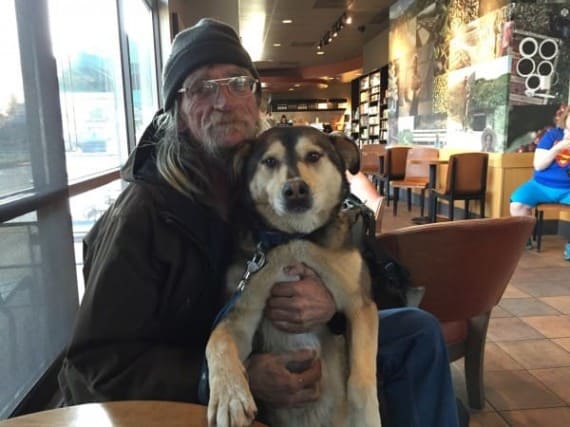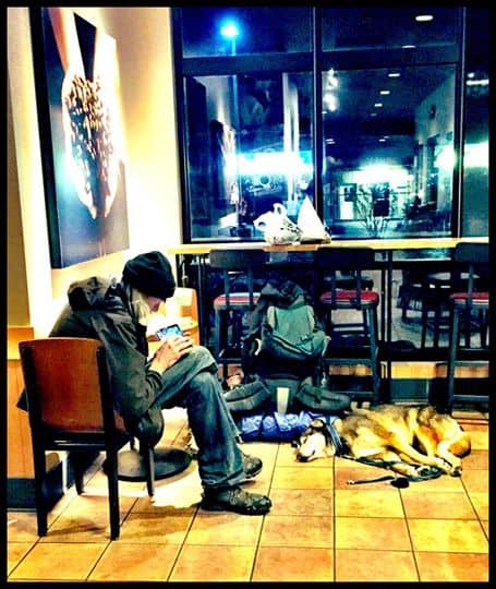 The homeless man and his dog in Starbucks.