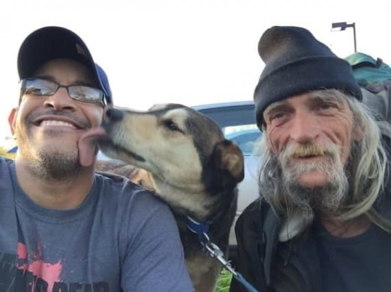 A close-up of the homeless man and Legacy.