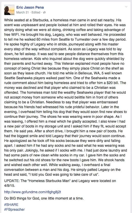 Little did Eric Jason Pena know when he walked into Starbucks that day that he would make a memory that’d last a lifetime. And it’s all because of a homeless man and his dog. A homeless man whom everyone else ignored and belittled.
