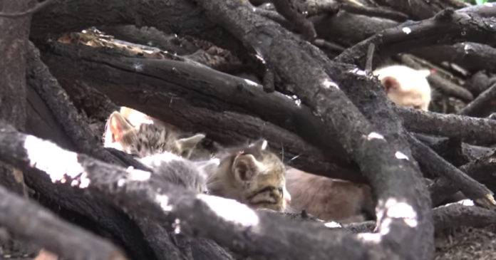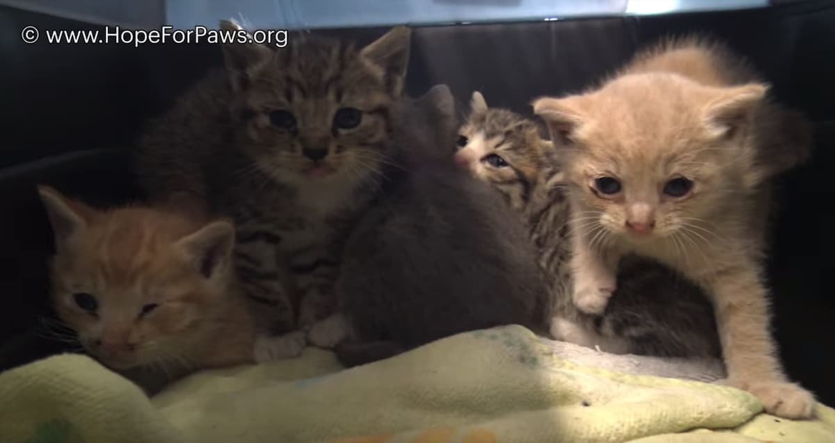 An LAPD deputy called Hope For Paws after she noticed some kittens tumbling down a hill by a busy freeway. JoAnn Wiltz and Katie McKittrick set out to rescue the little family and found them huddled up in a bush. All of the branches made it very difficult to reach them.