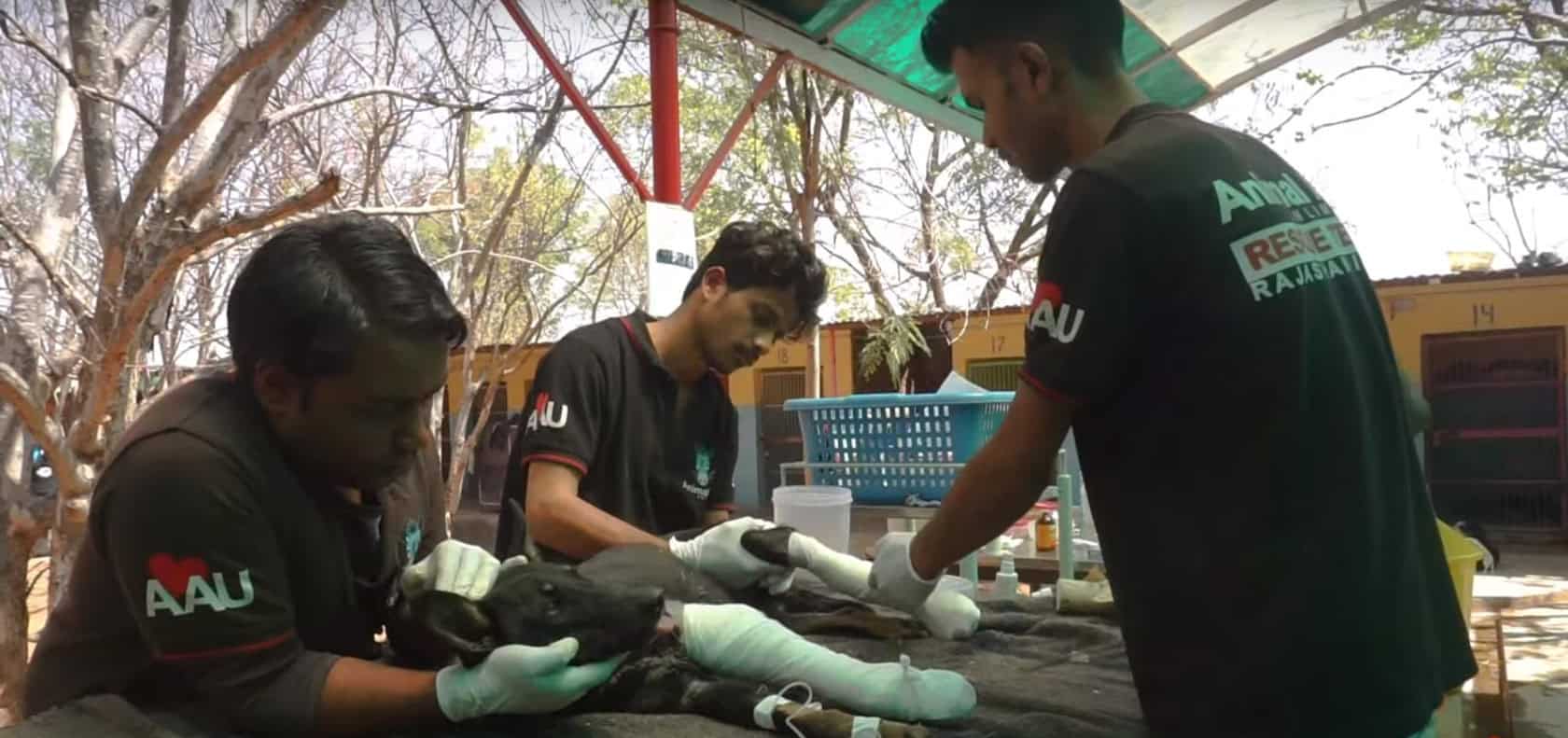 A young boy found an injured dog huddled up in a dark corner and knew to contact Animal Aid Unlimited. The rescuers arrived on scene to see the dog’s legs swollen and cut. He couldn’t even stand on his own. They prepared to get him back to the hospital immediately.