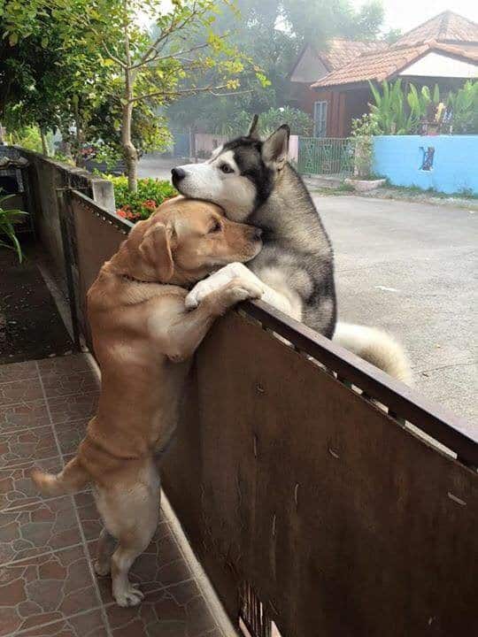 The lonely Husky saw his chance — not to run away but to go get a hug from Messy. Oranit looked outside and saw the special moment and took some photos. After the heartwarming hugging session, Audi ran back home!