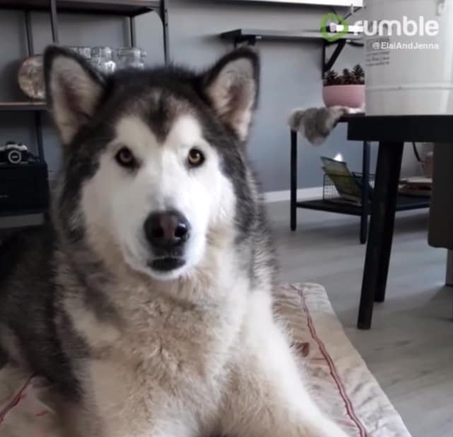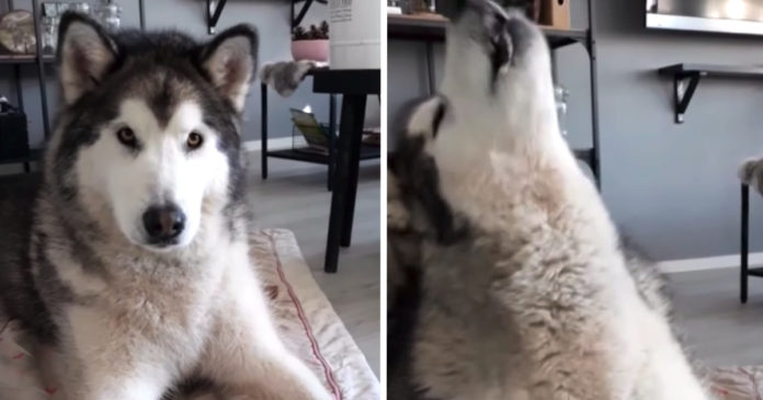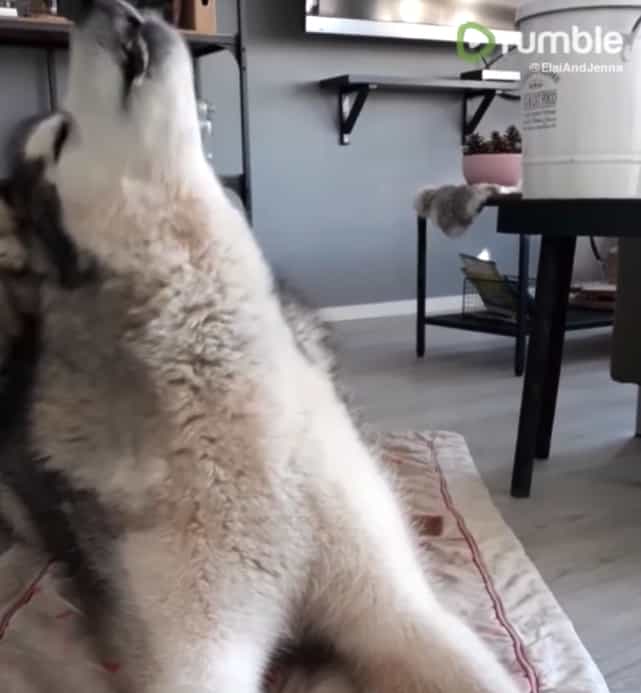 And the “woo” is Jenna the Malamute’s cue to come in! The smart pooch knows to sing then and only then, and it’s pretty remarkable. And look at that tail wagging! Jenna puts her all into this and loves every second of it.