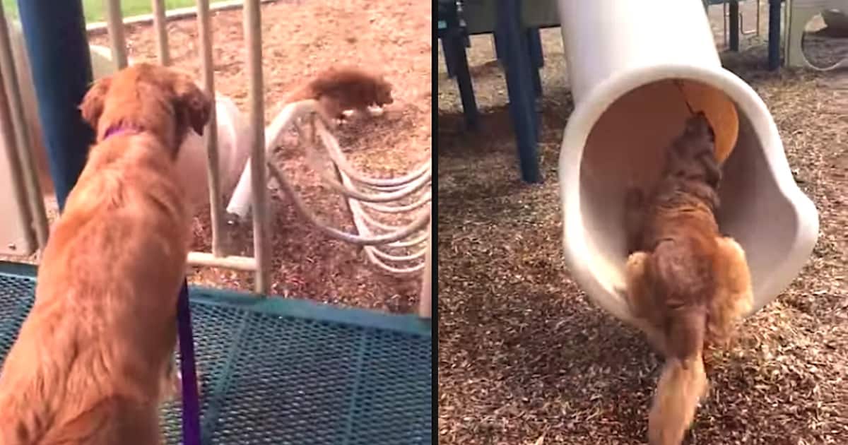In the video below, a mama Golden Retriever goes down the slide at the park. Her little one is right behind her, but she hesitates at the top. The mother dog goes back up to show her pup the way and yanks on her leash pulling her down the slide! Mama wasn’t messing around — she knew she could do it!