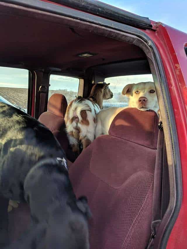 As they get closer, Dad realizes Bo is with another dog and… a goat? It sure is! Bo jumps into his owner’s vehicle and the other dog follows. Kyle figures “what the heck, why not” and invites the goat to hop inside too!