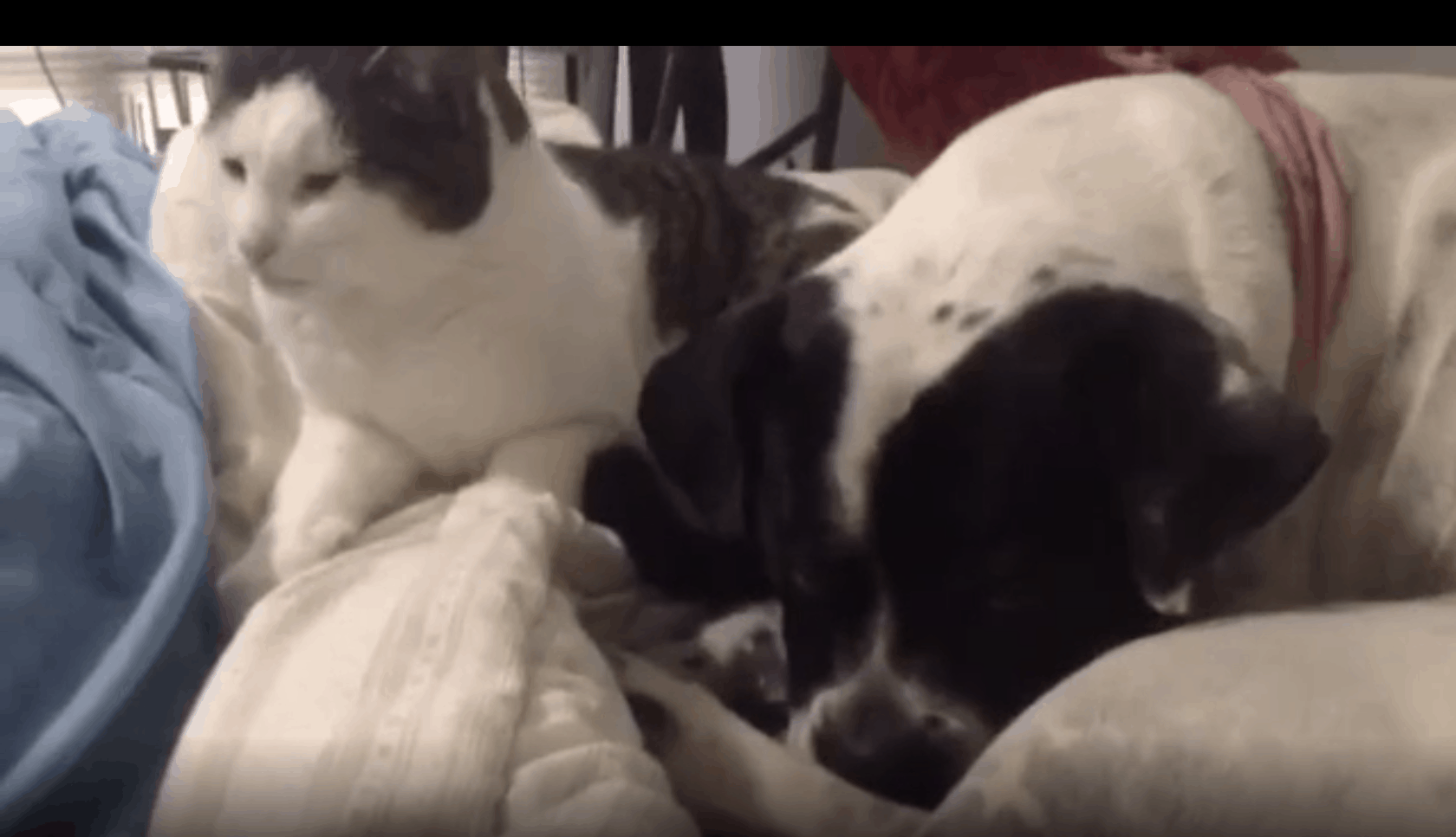 The morning routine between this cat and dog is too adorable. The lucky owner gets to wake up every morning to this cute cuddle session between two unlikely pals. This is what love is all about!