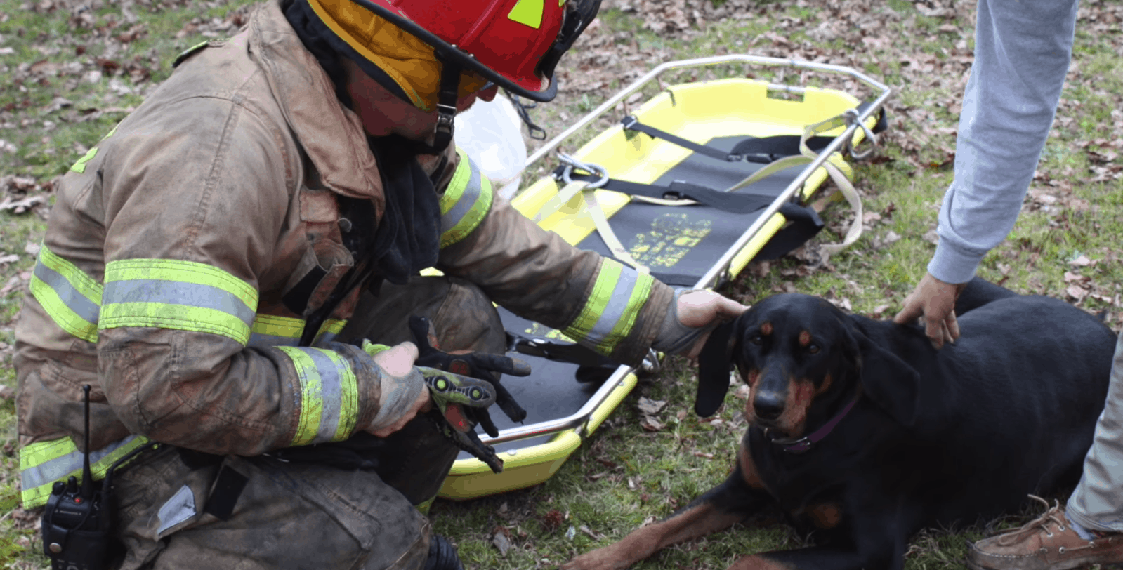 A Virginia firefighter rescues a dog from a house fire, but a neighbor says that there’s another dog in the house. The firefighter goes back inside and looks behind the couch. That’s when he sees the unconscious dog.