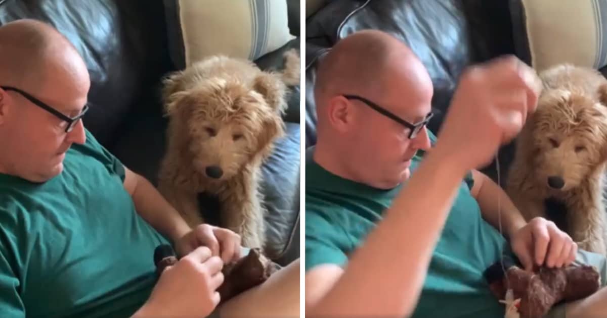 Leo accidentally (?) ripped a hole in the toy, and the white insides came out. Hayley’s dad took the toy and put it out of reach, but the dog kept crying and trying to get to it. So Dad took out the sewing kit and got to work to try and save its life.