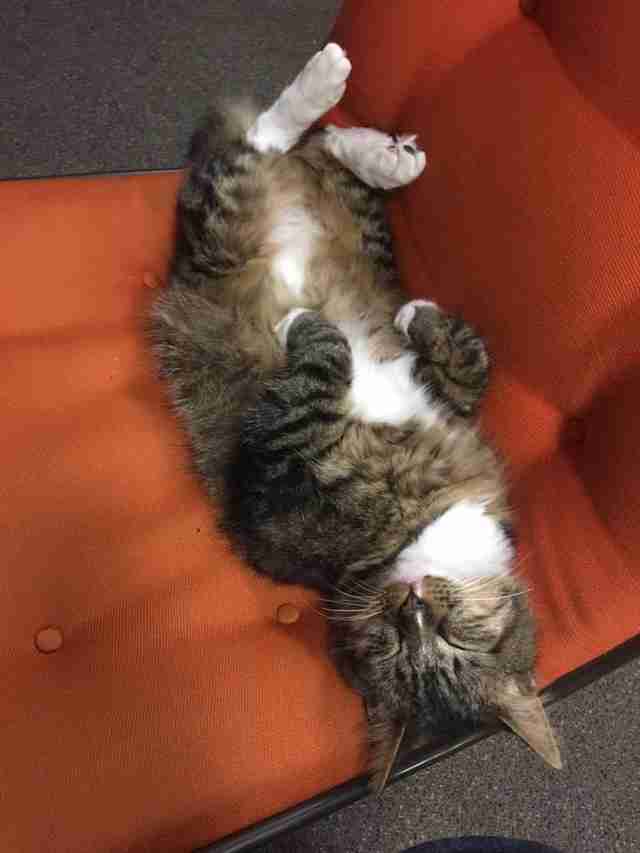 The lovable rescue kitty has been making quite a name for himself around the office of marketing firm GuRuStu, where he lives full time in downtown Tulsa, Oklahoma. During the day, he’s your typical feline employee, happy to offer a pleasant break for his colleagues, or hop atop their keyboard to send garbled emails on their behalf.