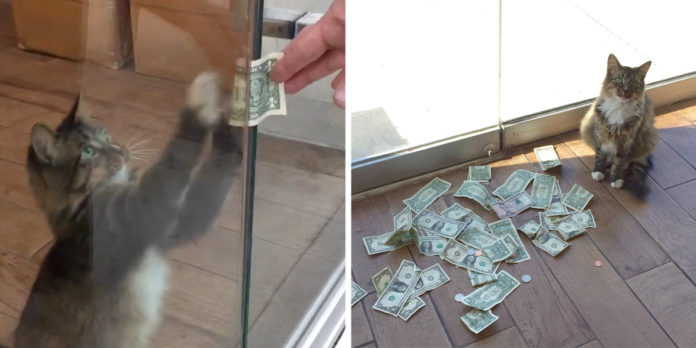 “It kept happening, but we didn’t know why. So we decided to test a theory,” McDaniel told The Dodo. “We tried sliding money through the gap in the door, and the cat hopped up and snatched it.”