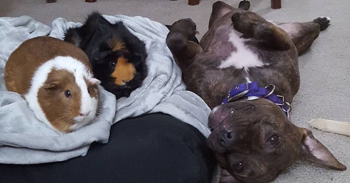 When this pit bull was adopted, she was instantly obsessed with the guinea pig cage in her new house. So their mom decided to introduce them — but the guinea pigs were not into it at first. Today on Odd Couples, watch how Moki persisted with all her pittie affection until the little piggies loved her right back ?