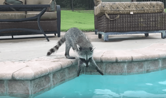 The dog decides that’s enough for one day and gets out of the pool. But Tito floats on an inflatable and swims around a bit more by himself. The video ends with amazing underwater footage of the raccoon’s little paws paddling around before he gets out and dries off.