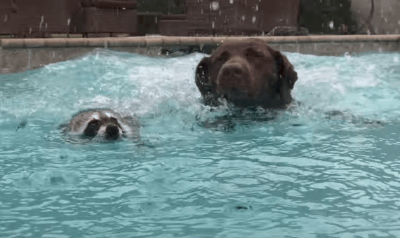 While you should never pick up a raccoon out of the wild and bring it home as a pet, Tito’s case is a lot different. He was rescued and raised alongside Penny the chocolate Labrador since he was just a baby, and they’ve become inseparable and somewhat dependant on each other. You’ll know what I mean when you see a typical day at the pool with them.