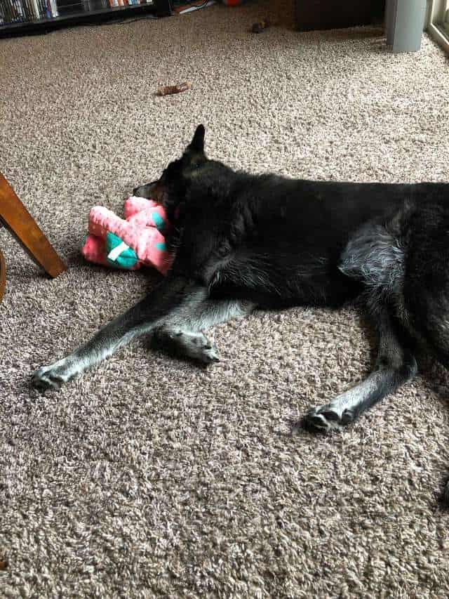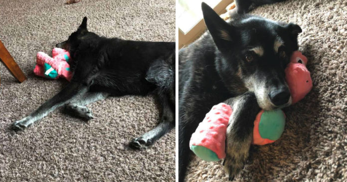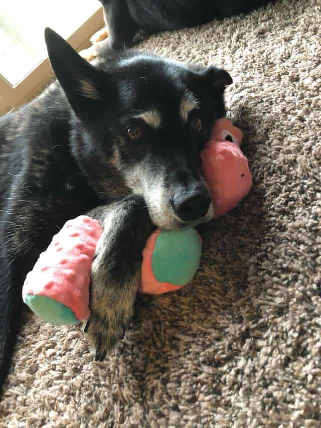 The senior dog has adjusted to her new life and home so much more quickly all thanks to this toy she can call her own. She’ll even place her paw on Mom’s arm to show her thanks for the second chance at life.