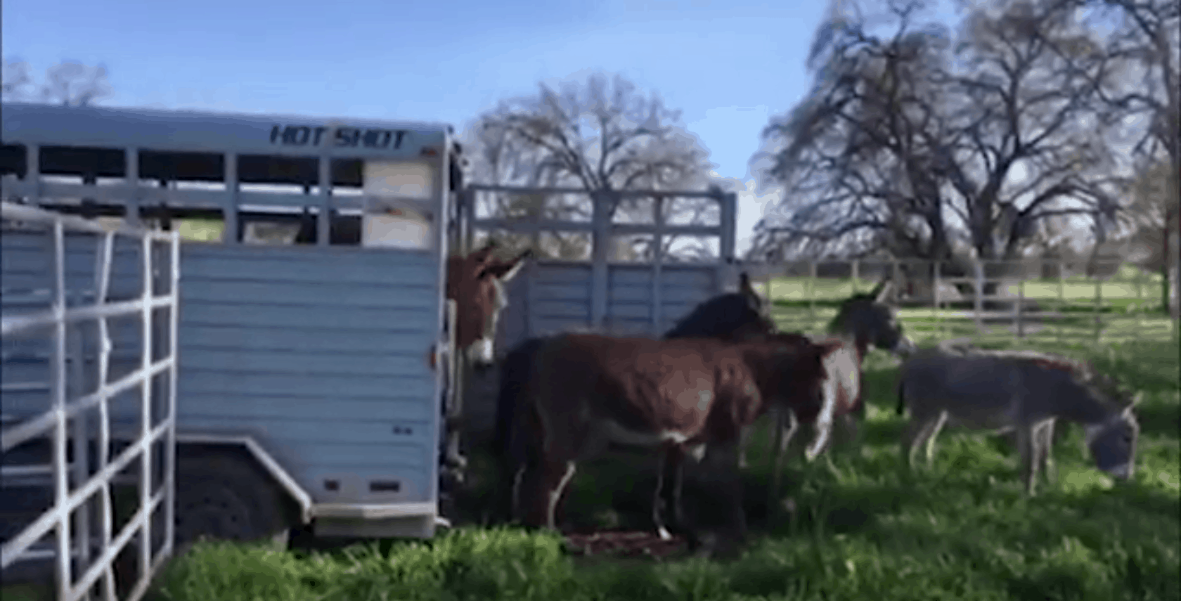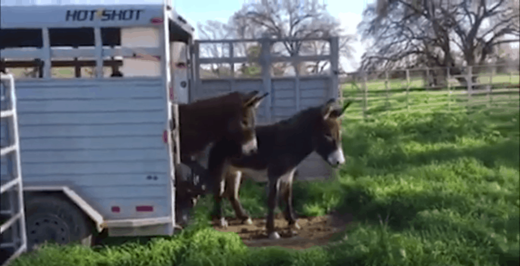 Watch as the first burro exits the truck and immediately jumps back at the sight of the grass before being joined by his buddies to explore it further.