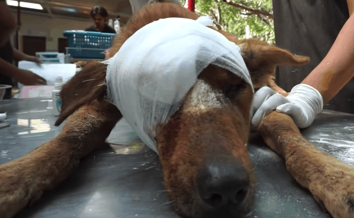 Rescuers took him back to the animal hospital to start saving his life. Hundreds of maggots infested the wound and were slowly killing the dog, so they poured some powder in the wound that would kill the maggots within three hours. Then it was time to clean and bandage the wound. The poor dog was so exhausted.
