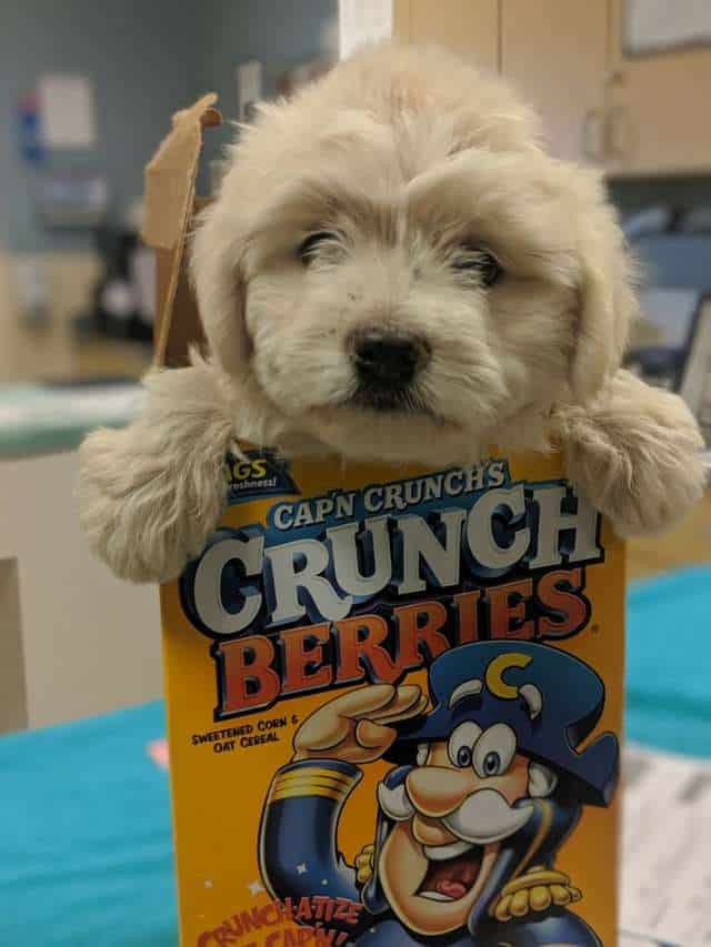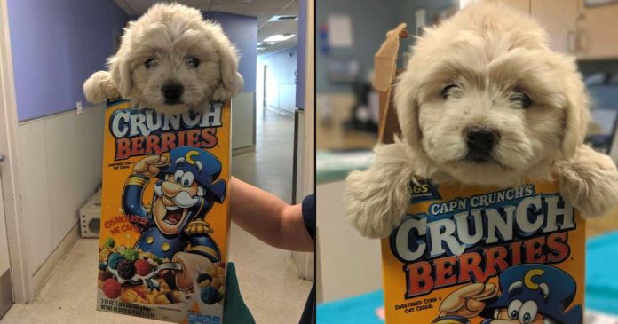Someone brought a Maltese/Yorkie mix pup to the county shelter in Riverside, California, in the strangest “carrier” the staff has ever seen. And they’ve seen a lot over the years! Here was a tiny, fluffy pup in a Crunch Berries cereal box.
