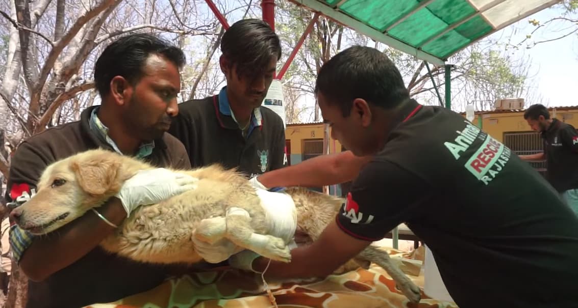 Animal Aid Unlimited received word of a stray dog with a severe burn who needed help. The dog was very sweet despite her pain and allowed rescuers to do what they had to do to save her. They took her back to the hospital to get to work on her right away.