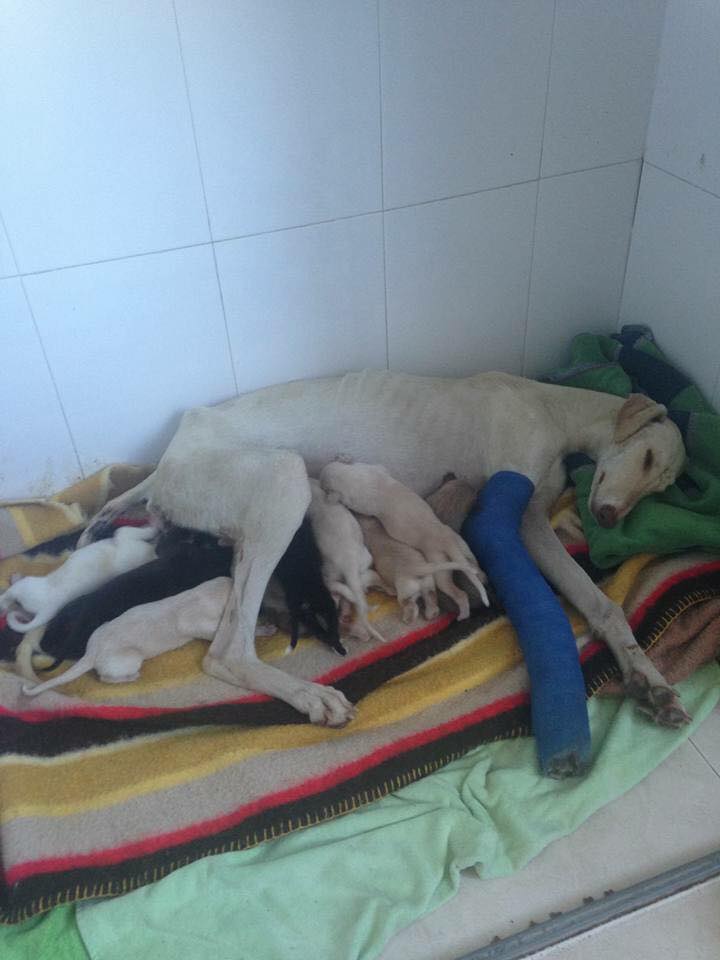 A stray Greyhound was found limping around on a broken leg, and it quickly became apparent that she was fighting to live for more than just herself. It turned out this injured dog was a mother.