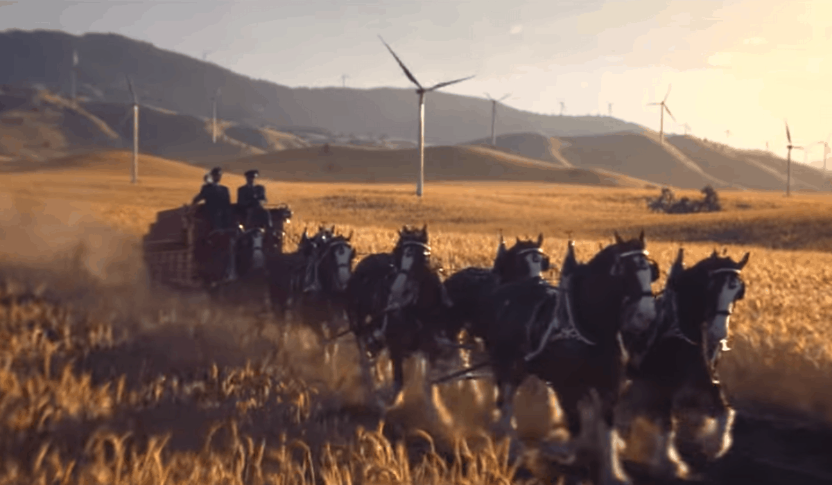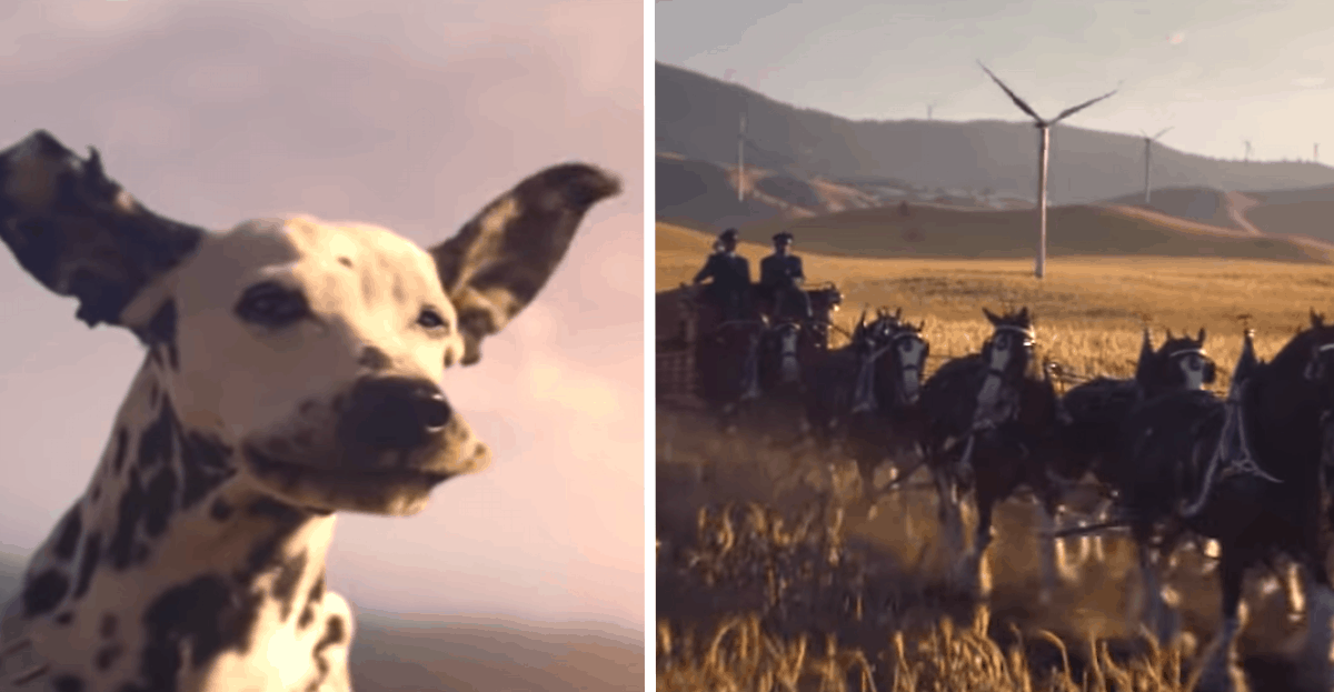 The ad kicks off with a dog enjoying the ride as the wind rushes through his ears. Bob Dylan’s “Blowin’ In The Wind” plays over the beautiful, heartwarming footage that reminds us of why we’ve always loved these commercials in the first place. The camera pans out to show the familiar Clydesdales pulling the beer wagon, and the words come across the screen: “Wind never felt better — now brewed with wind power for a better tomorrow.”