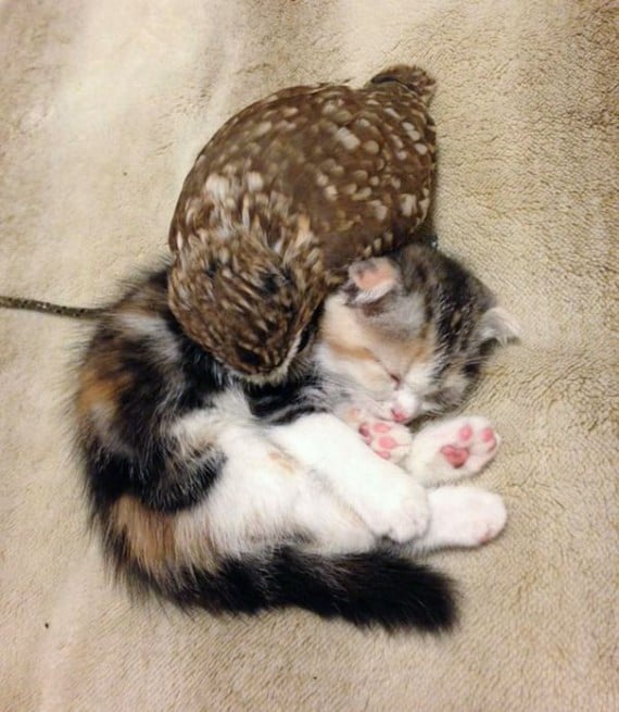 Fuku the owlet and Marimo the kitten are unlikely pals that live together at the Hukulou coffee shop in Osaka, Japan. Owl cafes are becoming a big thing in Japan and around the world, but these two make this one extra special!