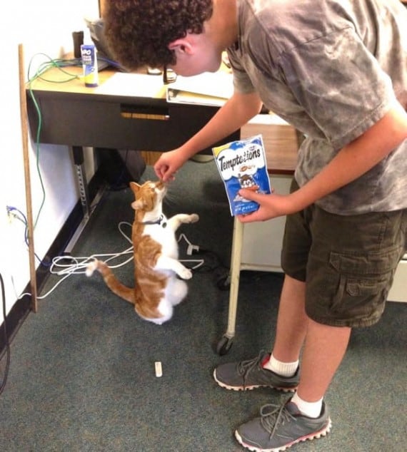 What a social kitty cat! His friendship is rewarded with treats.