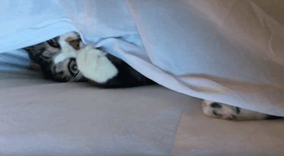 The joke’s over. Dad was just kidding the whole time. Lazy cat, you no longer have to act like you’re trying to put the fitted sheet on the bed. Go back to what you do best — hiding in the sheets, relaxing, and closing off the outside world.
